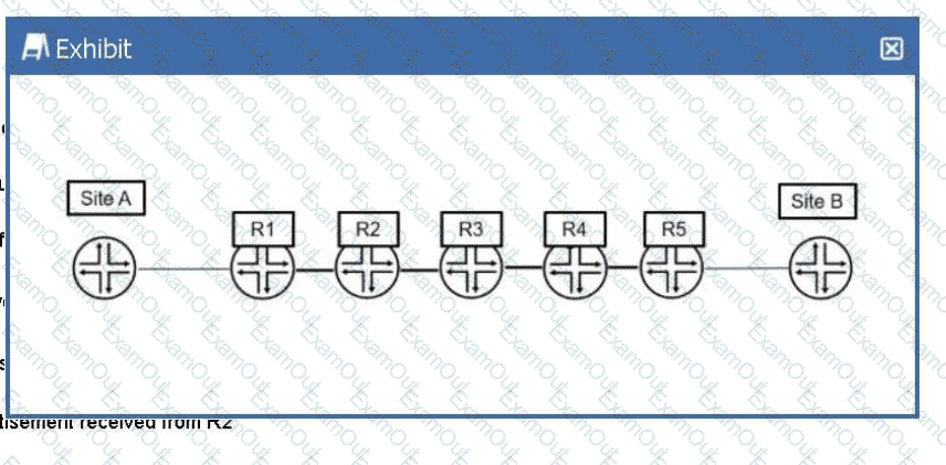 You have configured an MPLS LSP that begins on R1 and terminates on R5 using the Junos default settings. Referring to the exhibit, which router will perform only label swap operations?