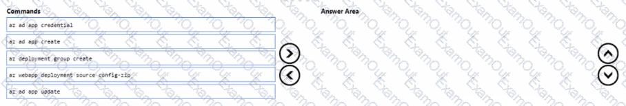 Which three Azure CLl commands should you run in sequence? To answer, move the appropriate commands from the list of commands to the answer area and arrange them in the client order.