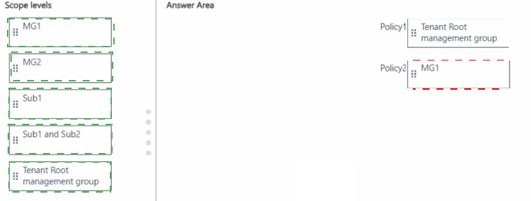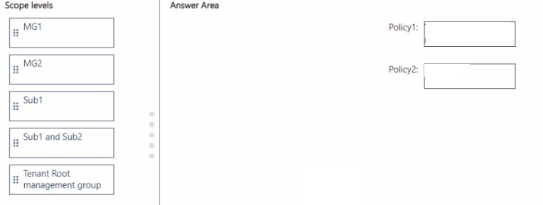 At which scope level should you assign each policy? To answer, drag the appropriate scope levels to the correct policies. Each scope level may be used once, more than once, or not at all. You may need to drag the split bar between panes or scroll to view content