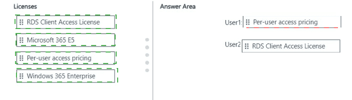 Which license should you recommend for each user? To answer, drag the appropriate licenses to the correct users. Each license may be used once, more than once, or not at all. You may need to drag the split bar between panes or scroll to view content.