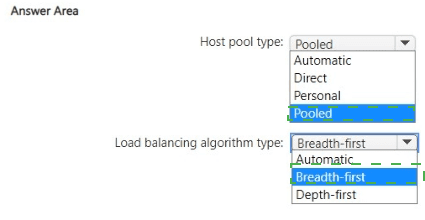 Which type of host pool and load balancing algorithm should you configure to meet the performance requirements? To answer, select the appropriate options in The answer area.