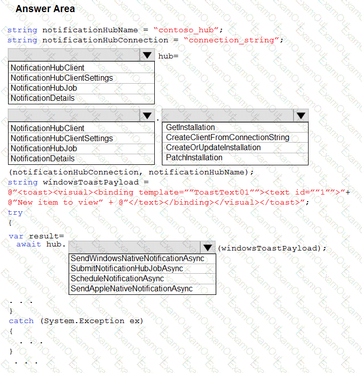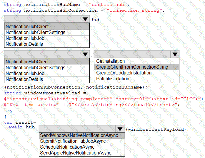 How should you complete the code segment? To answer, select the appropriate options in the answer area.
