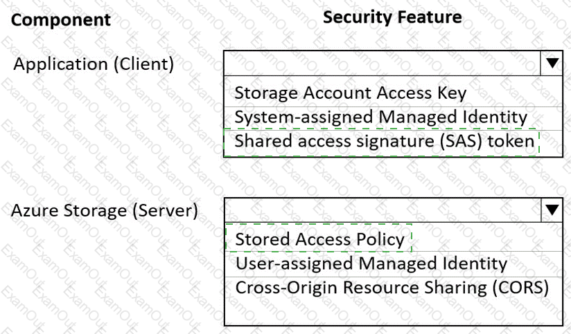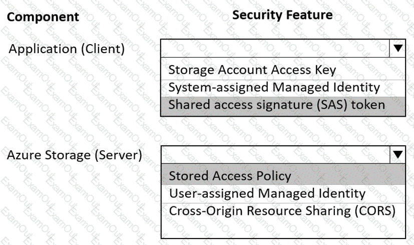 The application must be granted access to the Azure Blob storage account with a start time, expiry time, and read permissions. The Azure Blob storage account access must use the Azure AD credentials of the application to secure data access. Data access must be able to be revoked if the client application security is breached.