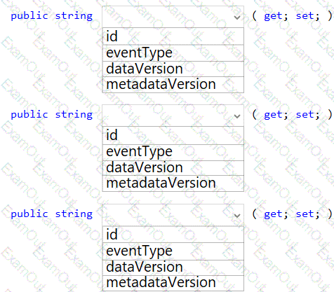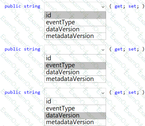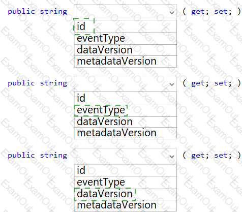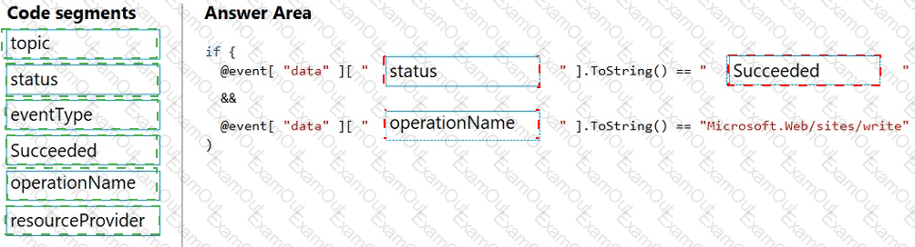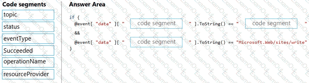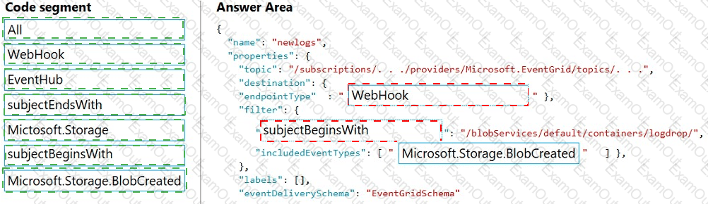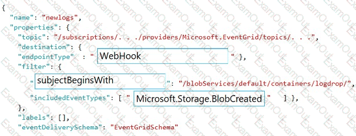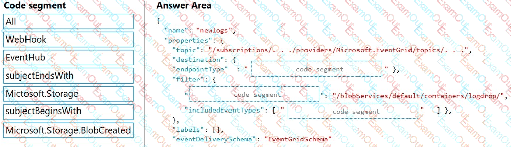 How should you complete the Azure Event Grid subscription? To answer, drag the appropriate JSON segments to the correct locations. Each JSON segment may be used once, more than once, or not at all. You may need to drag the split bar between panes to view content.