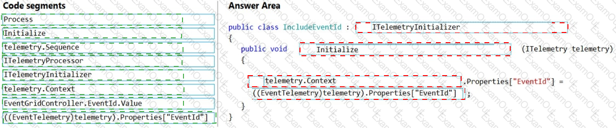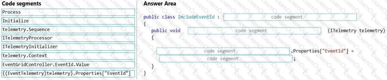 How should you complete the code segment? To answer, drag the appropriate code segments to the correct locations. Each code segment may be used once, more than once, or not at all. You may need to drag the split bar between panes or scroll to view content.