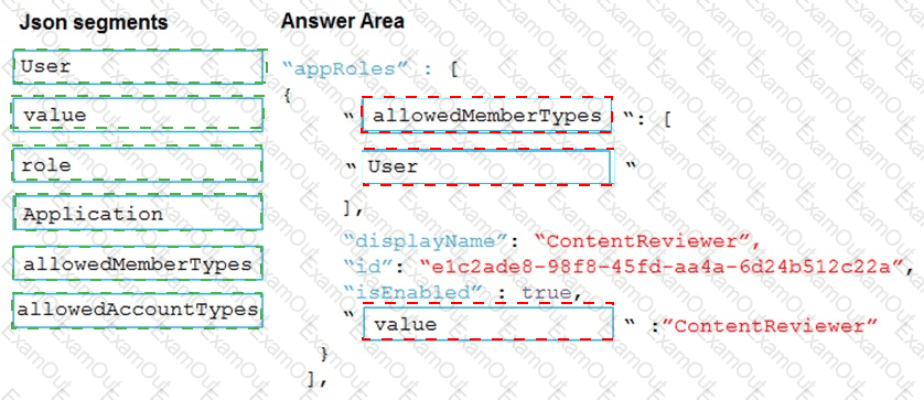 How should you complete the markup? To answer, drag the appropriate json segments to the correct locations. Each json segment may be used once, more than once, or not at all. You may need to drag the split bar between panes or scroll to view content.