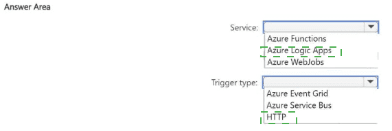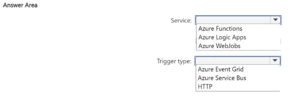 You need to recommend a service to host App2 and the type of trigger to use to call App2. The solution must minimize development effort.