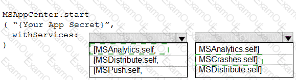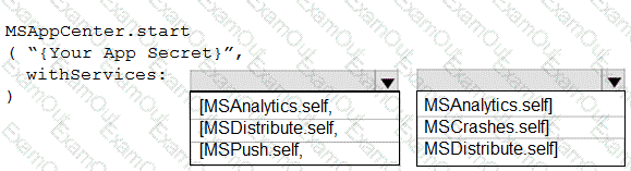 How should you complete the code to initialize App Center in the mobile application? To answer, select the appropriate options in the answer area.