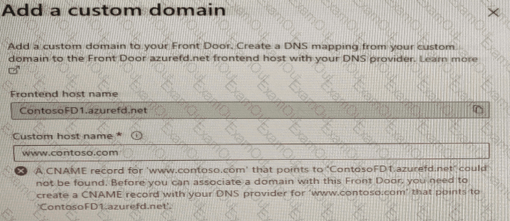 When you attempt to configure a custom domain for www.contoso.com on ContosoFD1, you receive the error message shown in the exhibit.