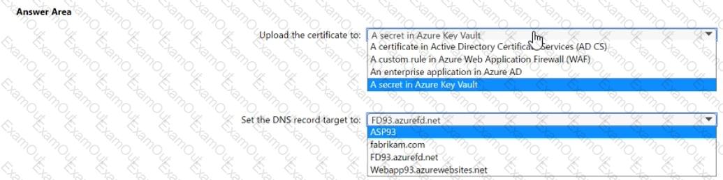 You need to configure a DNS record for www.fabrikam.com and upload the certificate to Azure. What should you do? To answer, select the appropriate options in the answer area. NOTE: Each correct selection is worth one point.