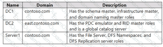 Your network contains an Active Directory Domain Services (AD DS) forest named contoso.com. The forest contains a child domain named east.contoso.com and the servers shown in the following table.