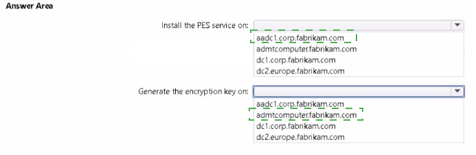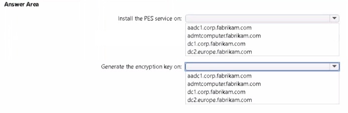 You are planning the europe.fabrikam.com migration to support the on-premises migration plan-Where should you install the Password Export Server (PES) service, where should you generate the encryption key? To answer, select the appropriate options in the answer area.