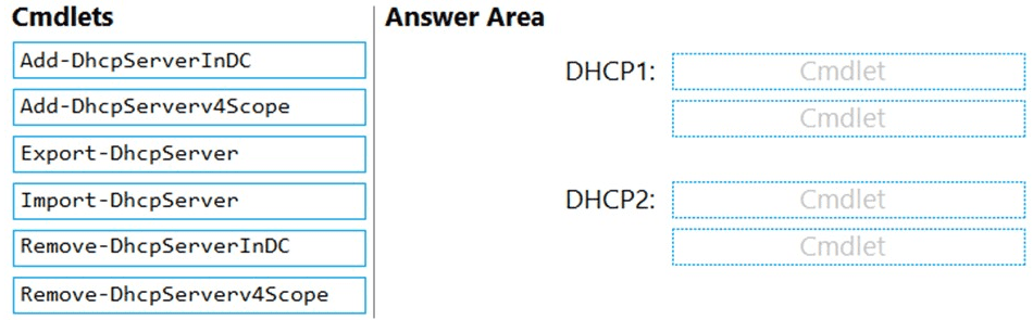 Which two PowerShell cmdlets should you run on DHCP1, and which two PowerShell cmdlets should you run on DHCP2? To answer, drag the appropriate cmdlets to the correct servers. Each cmdlet may be used once, more than once, or not at all. You may need to drag the split bar between panes or scroll to view content.
