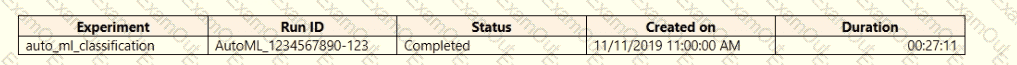 You run an automated machine learning experiment in an Azure Machine Learning workspace. Information about the run is listed in the table below:
