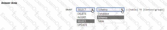 You have an Azure subscription that contains a group named Group1 and an Azure SQL managed instance that hosts a database named 081. You need to ensure that Group 1 has read access to new tables created m 06I The solution must use the principle of least privilege How should you complete the Transact-SQL statement' To answer, select the appropriate options in the answer area. NOTE: Each correct selection is worth one point.