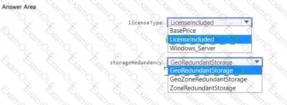 You need to specify the licenseType and storagenedundancy parameters. The deployment must meet the availability requirements and the business requirements for DB1 and DB2.