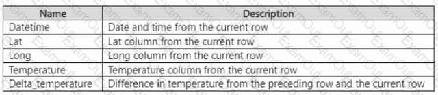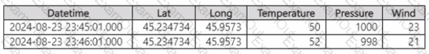 You have a Fabric eventhouse named Eventhousel that contains a table named Weatherdata. A sample of the data in Weatherdata is shown in the following table.