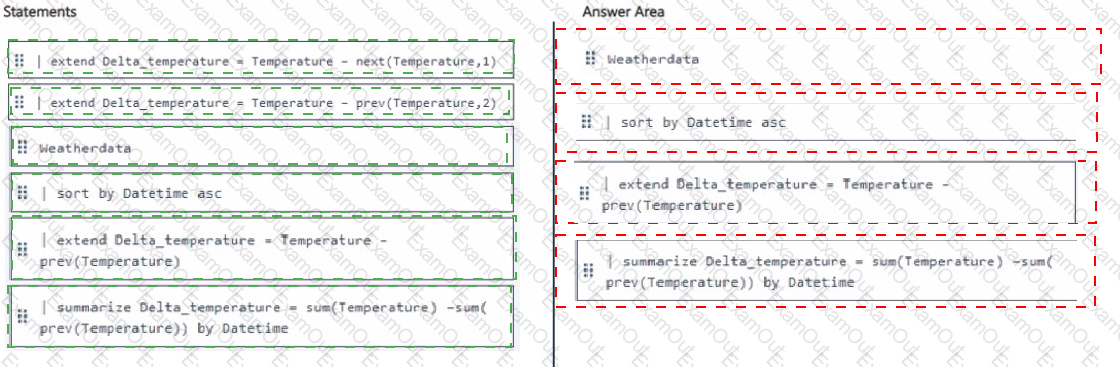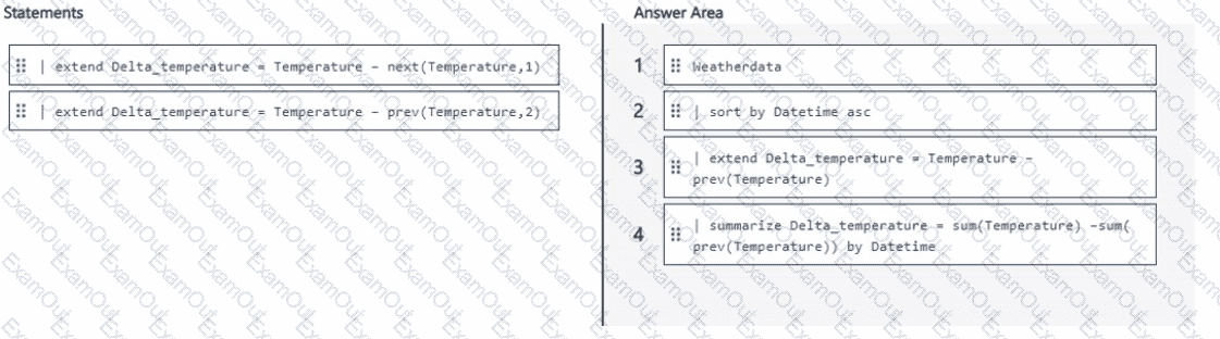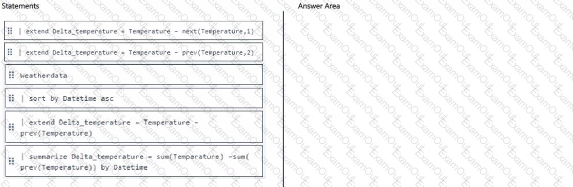 Which four KQL statements should you use in sequence? To answer, move the appropriate statements from the list of statements to the answer area and arrange them in the correct order.