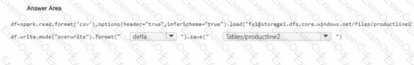 You need to migrate the Research division data for Productline2. The solution must meet the data preparation requirements. How should you complete the code? To answer, select the appropriate options in the answer area