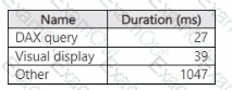 You open Performance analyzer and identify that a visual named Orders By Date is the slowest to render. The duration breakdown for Orders By Date is shown in the following table.
