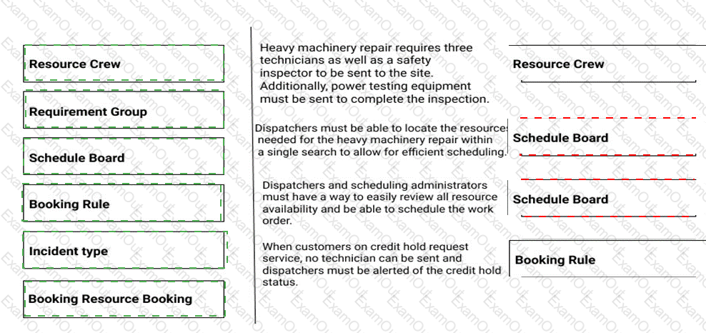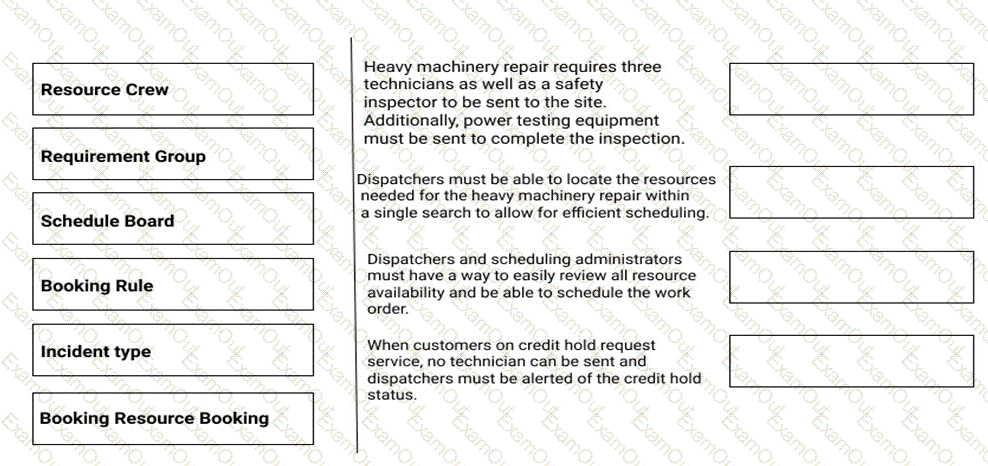 Your manager has asked you to configure the system to enable scheduling for maintenance of equipment at customer sites. It is against company policy to dispatch resources to sites with known issues such as credit or safety holds. Many site visits may require more than one technician to be sent for the repair.