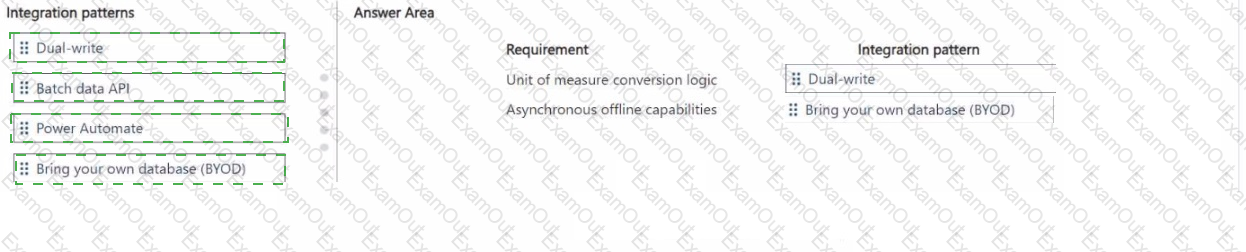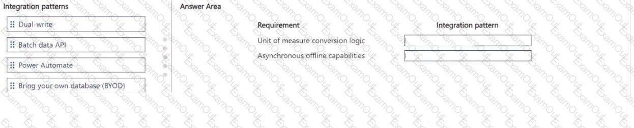 Which integration patterns should you recommend? To answer, drag the appropriate integration patterns to the correct requirements. Each integration pattern may be used once, more than once, or not at all. You may need to drag the split bar between panes or scroll to view content.