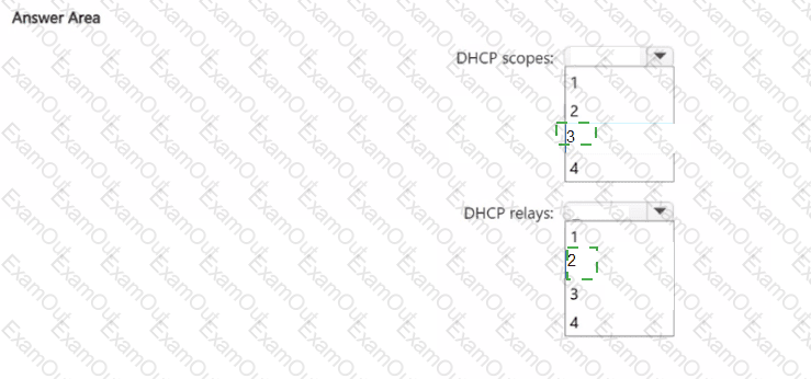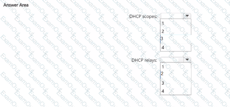 What is the minimum number of scopes and DHCP relays you should create? To answer, select the appropriate options in the answer area.