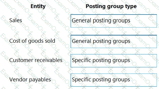 Which type of posting groups should you create? To answer, drag the appropriate posting group types to the correct entities. Each posting group type may be used once, more than once, or not at all. You may need to drag the split bar between panes or scroll to view content.