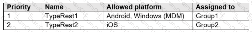 In Microsoft Endpoint Manager, you create two device type restrictions that have the settings shown in the following table.