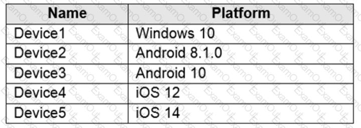 You have a Microsoft 365 E5 tenant that contains five devices enrolled in Microsoft Intune as shown in the following table.