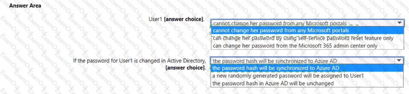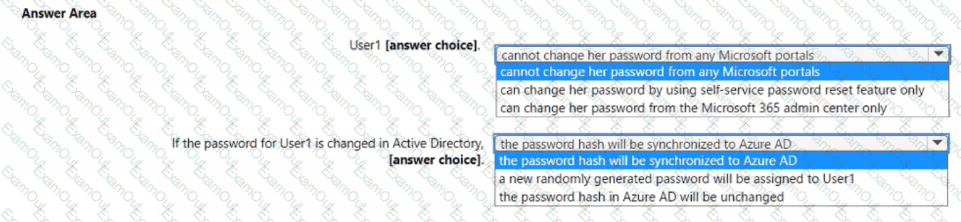 An on-premises user named User1 is synced to Azure AD.