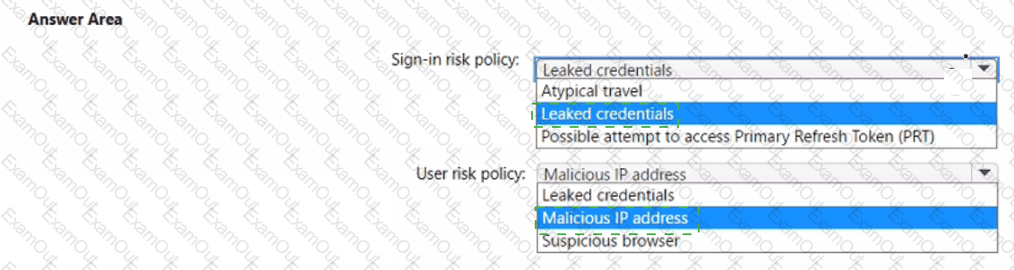 You plan to implement identity protection by configuring a sign-in risk policy and a user risk policy. Which type of risk is detected by each policy? To answer, select the appropriate options in the answer area.