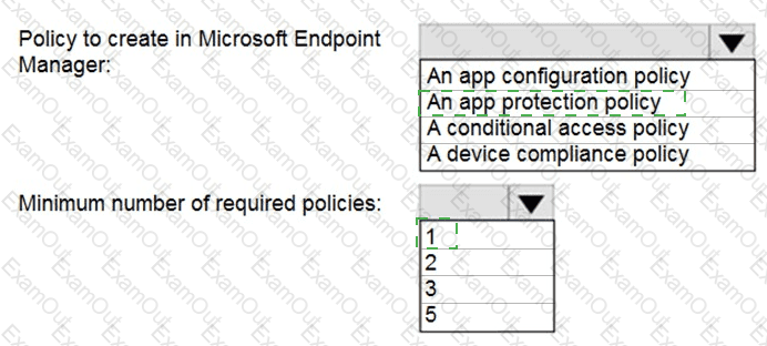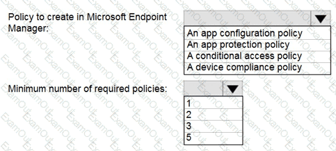 Which policy should you create in Microsoft Endpoint Manager, and what is the minimum number of required policies? To answer, select the appropriate options in the answer area.
