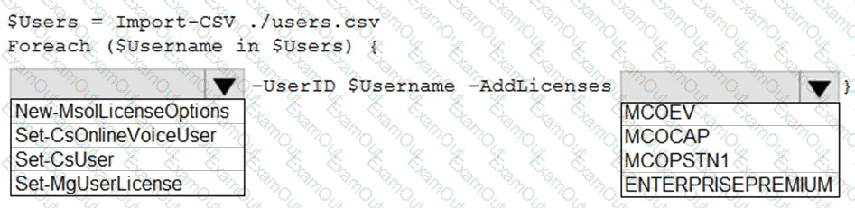 How should you complete the PowerShell script? To answer, select the appropriate options in the answer area.