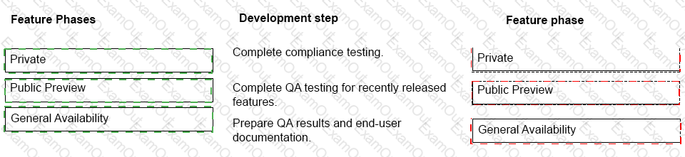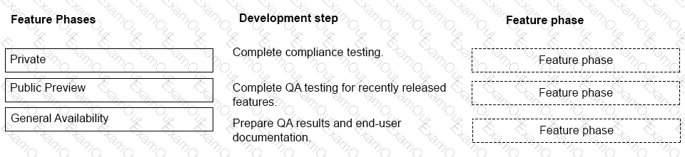 Which feature phase should you use for each development step? To answer, drag the appropriate feature phases to the correct development steps. Each feature phase may be used once, more than once, or not at all. You may need to drag the split bar between panes or scroll to view content