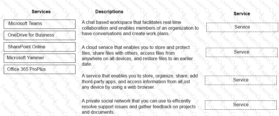 Match each Microsoft 365 service to the most appropriate service description. To answer, drag the appropriate services to the correct descriptions. Each service may be used once, more than once, or not at all. You may need to drag the split bar between panes or scroll to view content.