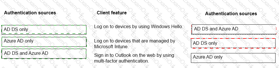 Match each feature to its authentication source. To answer, drag the appropriate authentication sources from the column on the left to the client features on the right. Each authentication source may be used once, more than once, or not at al.
