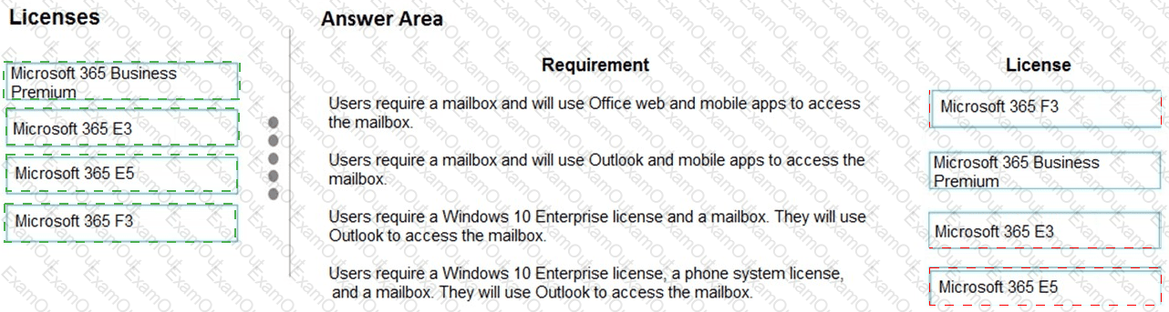 Match each licenseto its requirement. To answer, drag the appropriate license from the column on the left to its requirement on the right. Each license may be used once, more than once, or not at all.