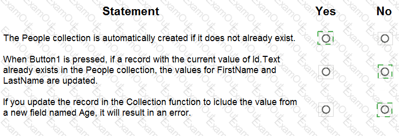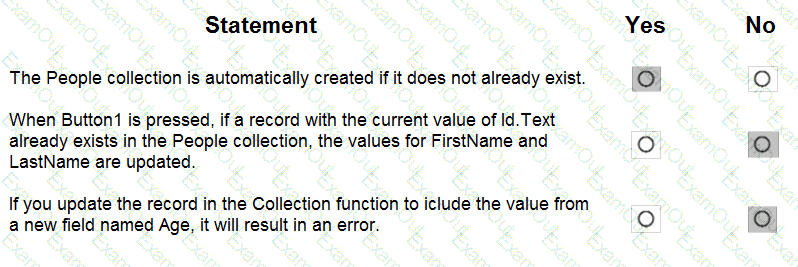 You have a canvas app that contains the following text input fields: Id, FirstName, LastName. The app also has a button named Button1.
