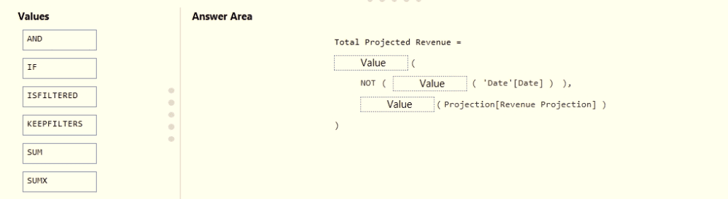 How should you complete the measure? To answer, drag the appropriate values to the correct targets. Each value may be used once, more than once, or not at all. You may need to drag the split bar between panes or scroll to view content.