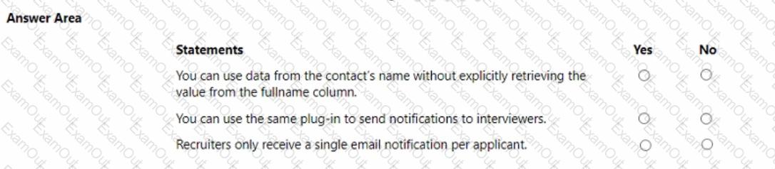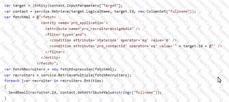 You develop the following code for the plug-in that sends email notifications to recruiters.