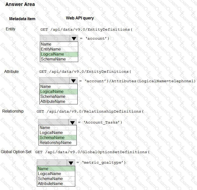 How should you complete the Web API queries? To answer, select the appropriate options in the answer area.
