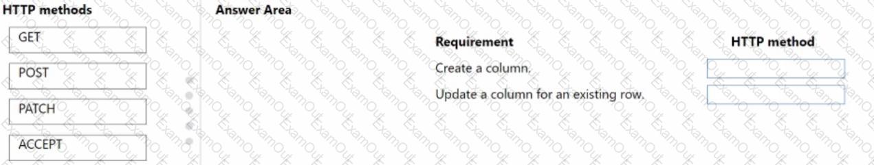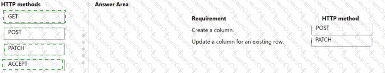Which HTTP methods should you use? To answer, drag the appropriate HTTP method to the correct requirements. Each HTTP method may be used once, more than once, or not at all. You may need to drag the split bar between panes or scroll to view content.