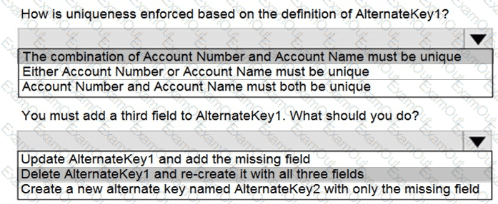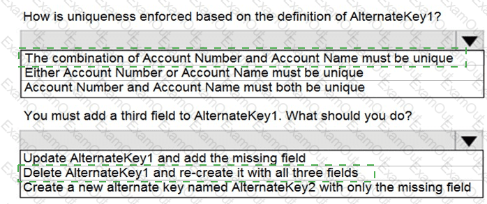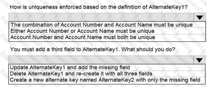You create an alternate key named AlternateKey1 on the Account entity. The definition for AlternateKey1 is shown in the following exhibit: