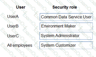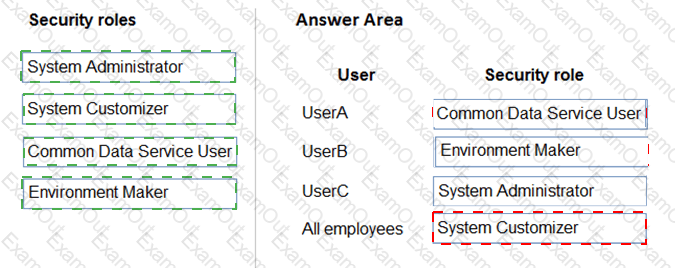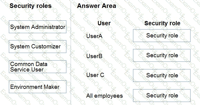 Which security roles should you use? To answer, drag the appropriate security roles to the correct users. Each security role may be used once, more than once, or not at all. You may need to drag the split bar between panes or scroll to view content.