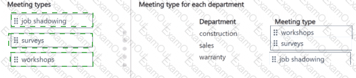 To answer, move the appropriate meeting types to the correct departments. You may use each meeting type once, more than once, or not at all. You may need to move the split bar between panes or scroll to view content.