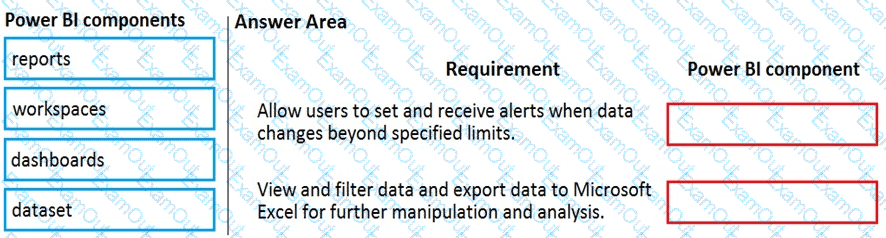 Which Power BI components should the company use? To answer, drag the appropriate Power BI components to the correct requirements. Each Power BI component may be used once, more than once, or not at all. You may need to drag the split bar between panes or scroll to view content.