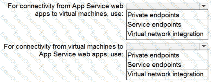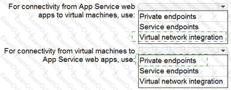 You need to recommend a strategy for App Service web app connectivity. The solution must meet the landing zone requirements. What should you recommend? To answer, select the appropriate options in the answer area. NOTE Each correct selection is worth one point.