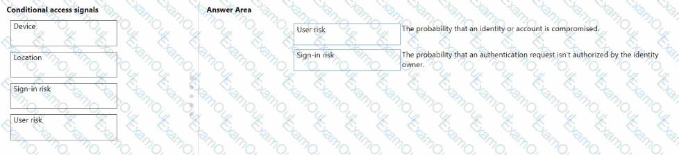 To answer, drag the appropriate Conditional Access signal type from the column on the left to its definition on the right. Each signal type may be used once, more than once, or not at all.