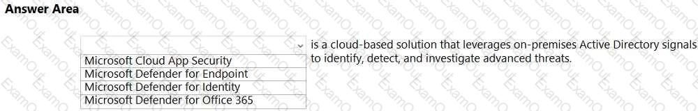 This precisely matches the sentence in the prompt: the only Microsoft security product whose core purpose is to use on-premises AD signals to identify, detect, and investigate advanced threats is Defender for Identity. By contrast, Microsoft Defender for Endpoint focuses on endpoint prevention and EDR; Microsoft Defender for Office 365 protects email and collaboration workloads from phishing and malware; and Microsoft Cloud App Security (now Microsoft Defender for Cloud Apps) operates as a CASB for app discovery, control, and session monitoring. Therefore, aligning with SCI study guides and product descriptions, the correct completion is Microsoft Defender for Identity.